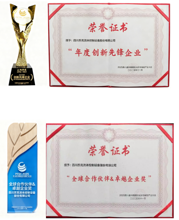 在成都召开的“2025第八届中国国际光伏与储能产业大会”上,苏克流体荣膺“年度创新先锋企业”和“全球合作伙伴&卓越企业奖”两项重量级殊荣。